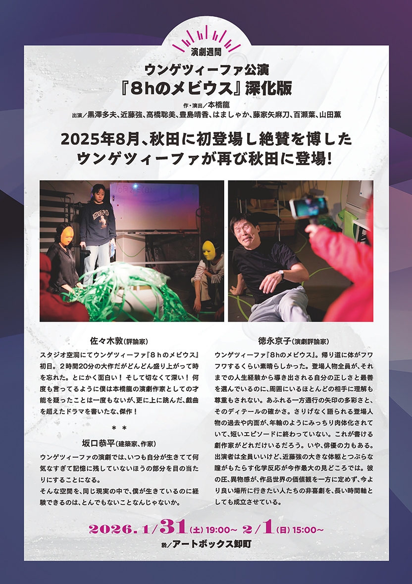 開催期間を「演劇週間」と「ダンス週間」の二つに分け、「演劇週間」には~秋~編に登場したウンゲツィーファを再度招聘、同劇団の評価を不動のものにした名作『8hのメビウス』を上演します。