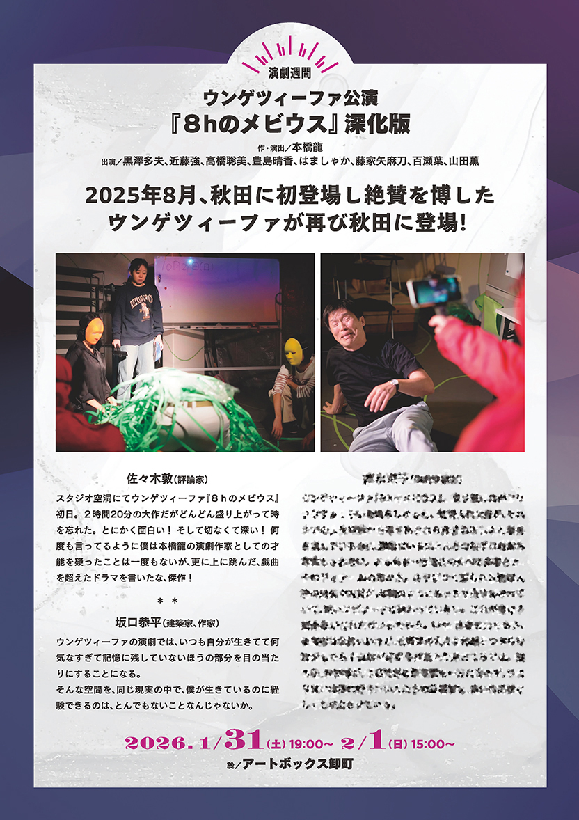 開催期間を「演劇週間」と「ダンス週間」の二つに分け、「演劇週間」には~秋~編に登場したウンゲツィーファを再度招聘、同劇団の評価を不動のものにした名作『8hのメビウス』を上演します。